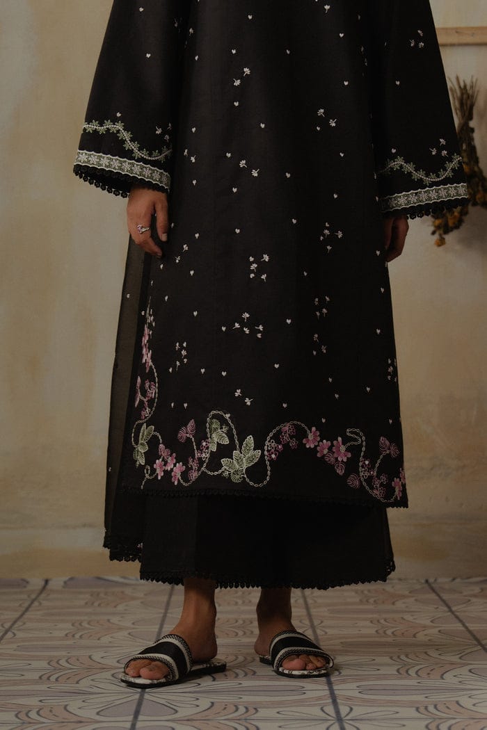 The kurta features delicate scattered embroidery with a scalloped neckline and subtle cut-out detail, while the cuffs are adorned with intricate patterns. The hemline is beautifully enhanced with pastel floral embroidery, adding a soft feminine touch against the bold black base.