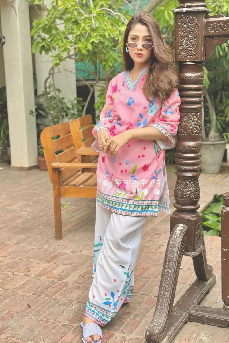 Fresh, feminine, and effortlessly stylish – the Pink Floral 2-piece set is crafted from premium silk brand fabric for a breezy and elegant winter look. With its chic short-length shirt and matching plazo, this ready-to-wear outfit is designed for all-day comfort and everyday sophistication.