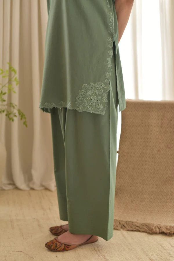 Sabz Sitara is a refreshing 3-piece suit that exudes calm elegance and timeless charm. This ensemble features a soft sage green shirt with delicate embroidery on the neckline, sleeves, and hemline, paired with matching wide-leg trousers for a relaxed yet graceful silhouette. The look is completed with a lightweight dupatta in the same soothing tone, enhancing the outfit's airy and elegant appeal. Perfect for daytime gatherings, casual outings, or summer festivities, Sabz Sitara blends comfort with sophistication effortlessly.